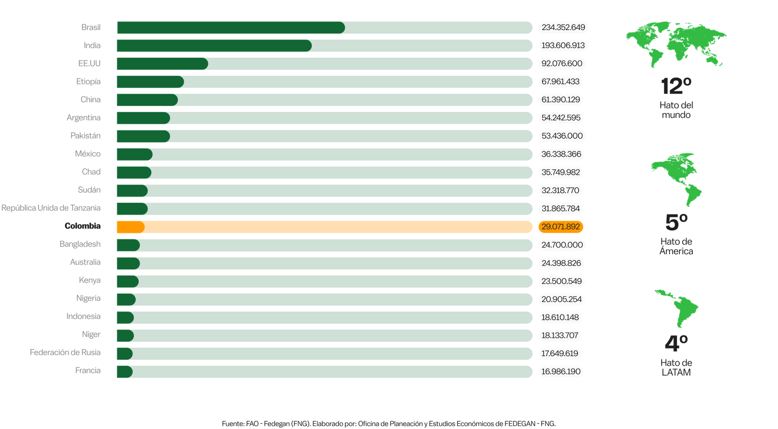 El país ocupa el puesto 12 a nivel mundial en tamaño de hatoganadero y el 5º en América. Nuestra ganadería combina tradición con innovación, apostando por la sostenibilidad y apertura de nuevos mercados internacionales.